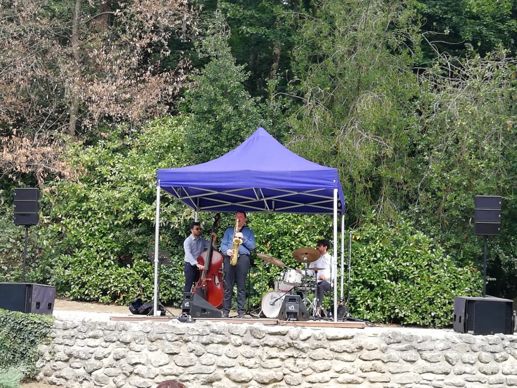 Le Trio de Vincent Thékal, composé de Giuseppe Millaci à la contrebasse et de Fabio Zamagni à la batterie a animé avec élégance le parc de Wolvendael ce 4 août passé. Sous un soleil radieux, ils nous ont offert une suite de standards du song book américain, parfaitement adaptés à l’ambiance du parc de ce dimanche après-midi. Le public très varié, allant des connaisseurs aguerris aux familles en balade en passant par les promeneurs ou touristes de passage, se sont tous posés; et dans ce calme soudain, la musique finement ciselée par nos interprètes du jour a arrêté le temps pour un moment de plaisir de calme, une respiration champêtre embaumant la note bleue.